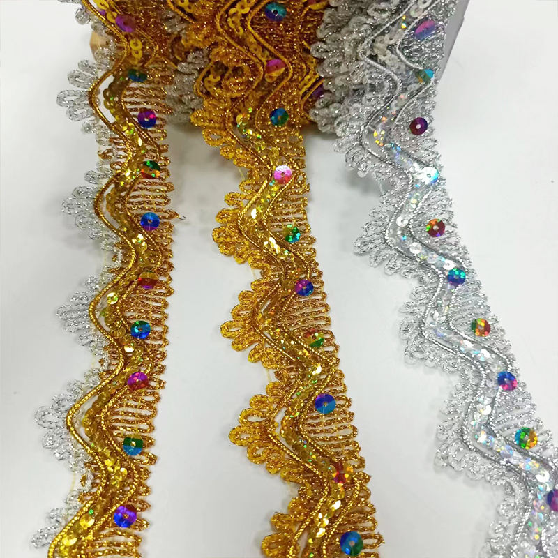 Accessori di abbigliamento Finione in pizzo in oro in oro-bordo metallico in oro e argento rivestimento in pizzo metallico decorato con fili in metallo bicolore in oro e argento e paillettes a sette colori, crea un magnifico e abbagliante effetto di bordi. È adatto alla decorazione di polsini, collari e orli di abbigliamento di fascia alta come abiti da sera, costumi da palcoscenico e abiti da sposa. Il materiale è leggero e flessibile, non si sbiadisce o una pillola e supporta la larghezza e i motivi personalizzati, aggiungendo una lussuosa lucentezza agli indumenti.
