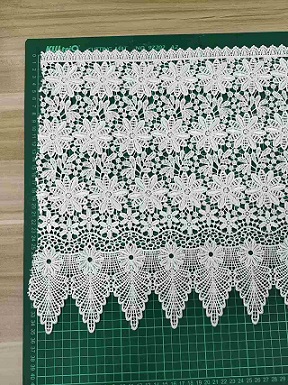 Il pizzo solubile in acqua in pizzo guipure di poliestere è un tipo di pizzo realizzato in poliestere ed è progettato per dissolversi in acqua. Questo pizzo viene creato utilizzando una speciale tecnica di ricamo che si traduce in un tessuto di pizzo dal disegno aperto e intricato. Il rivestimento in pizzo idrosolubile in pizzo di poliestere guipure è solitamente disponibile in un colore bianco o bianco sporco ed è popolare per l'uso in abiti da sposa, veli da sposa e altri abiti formali. La natura solubile in acqua del pizzo lo rende perfetto per i dettagli su tessuti trasparenti, come abiti fluidi. Con il suo design unico e intricato e le proprietà solubili in acqua, il pizzo solubile in acqua in pizzo di poliestere guipure è una scelta popolare per coloro che desiderano creare abbellimenti unici ed eleganti nei loro progetti di moda, costumi e artigianato.