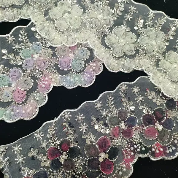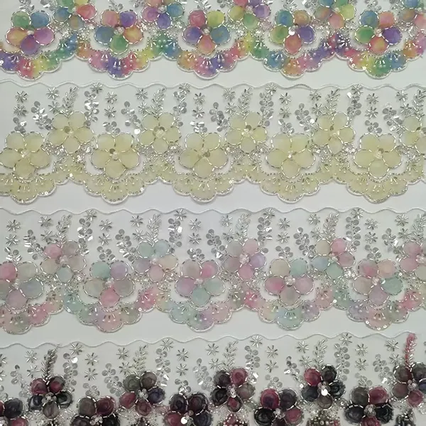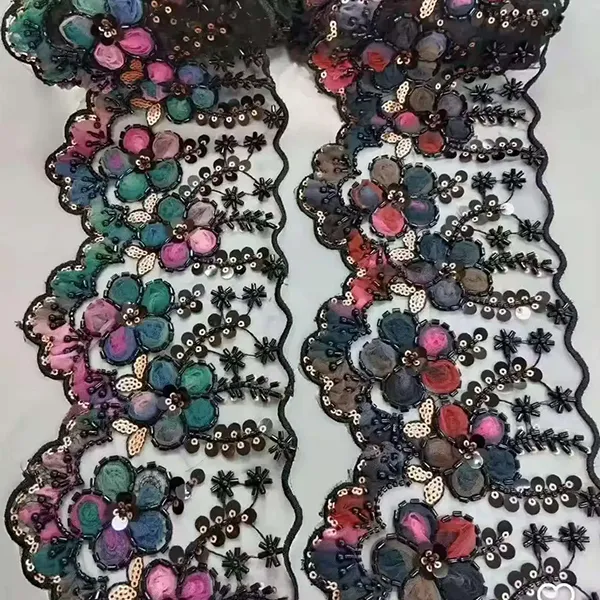 | Merce | Pizzo ricamato multicolore con pizzo ricamato con codice a barre a tubo in rilievo e fiori in rete 3D | ||